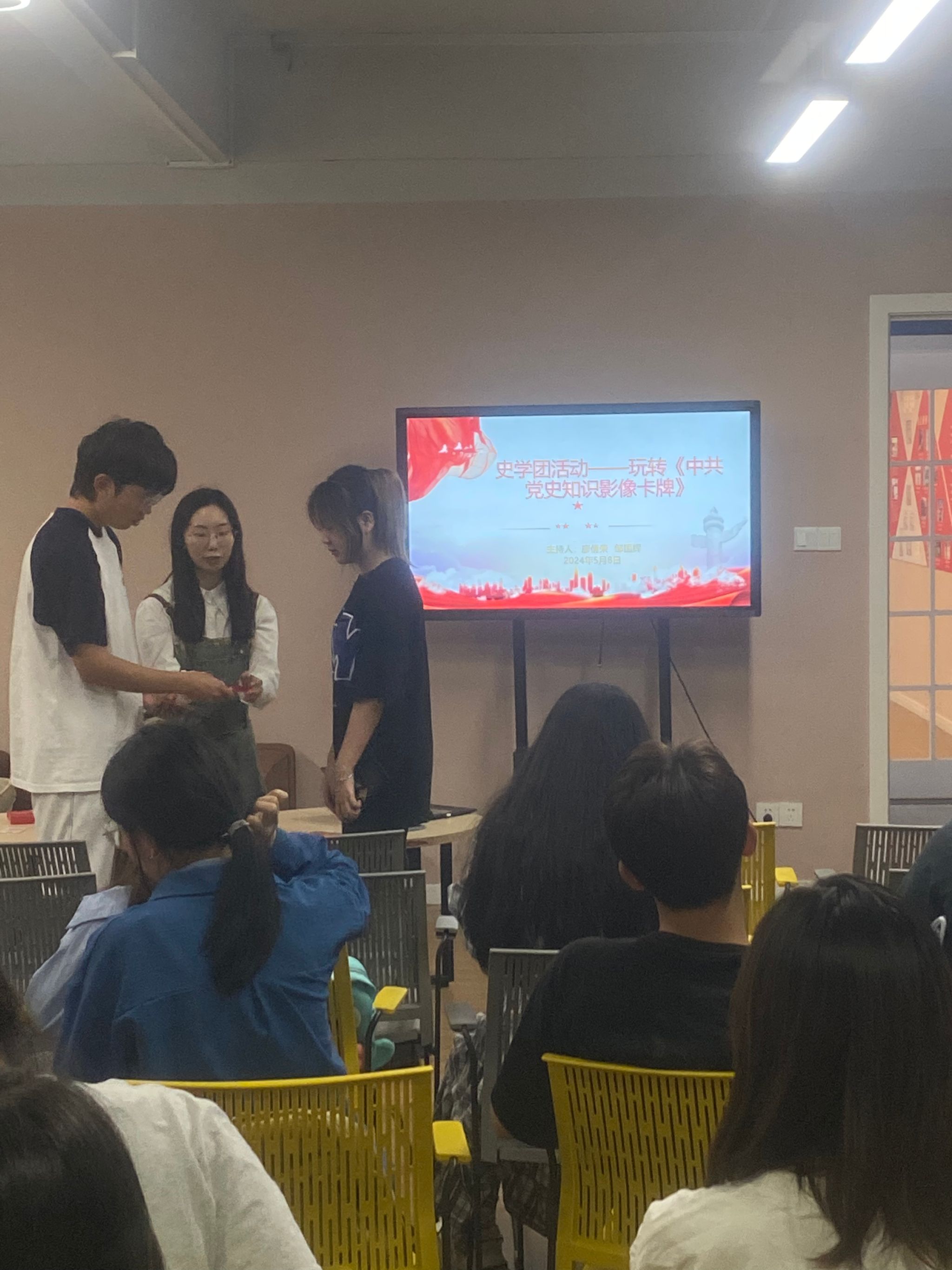 活动伊始,邹国辉老师首先为同学们讲解了一些党史知识,然后详细介绍了《中国党史知识影像卡牌》活动的游戏规则,为了让更多的同学参与,活动采用“个人战”的游戏玩法,最后那位同学手里的卡牌最多,便是最后的“大赢家”。
