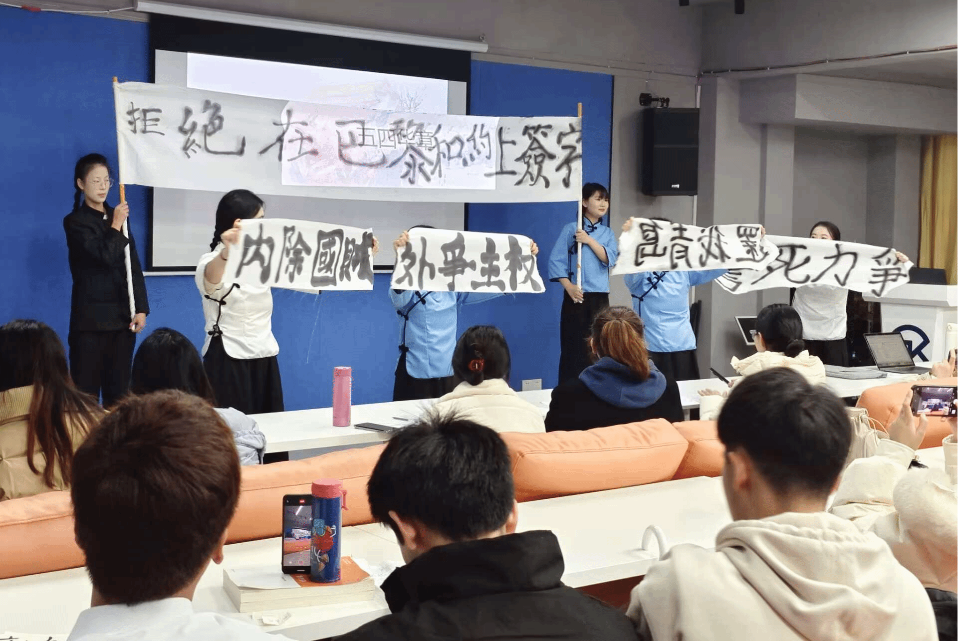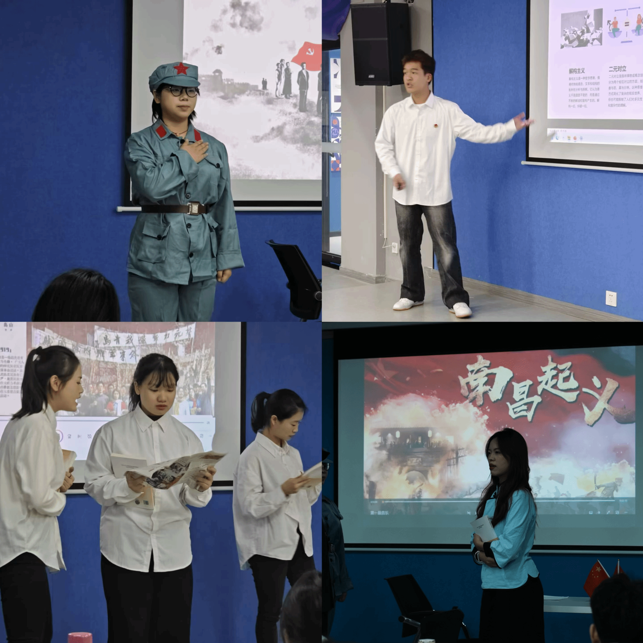 2024级英语专升本7班的同学们带来了话剧表演,他们生动地演绎了1919年青年大学生反对在巴黎和会上签字的情景。演员们通过细腻的表演和逼真的场景再现,将观众带入了那个风起云涌的年代,感受到了青年学生们的爱国热情和坚定信念。他们的表演深情而富有感染力,让观众深受触动,现场掌声雷动。