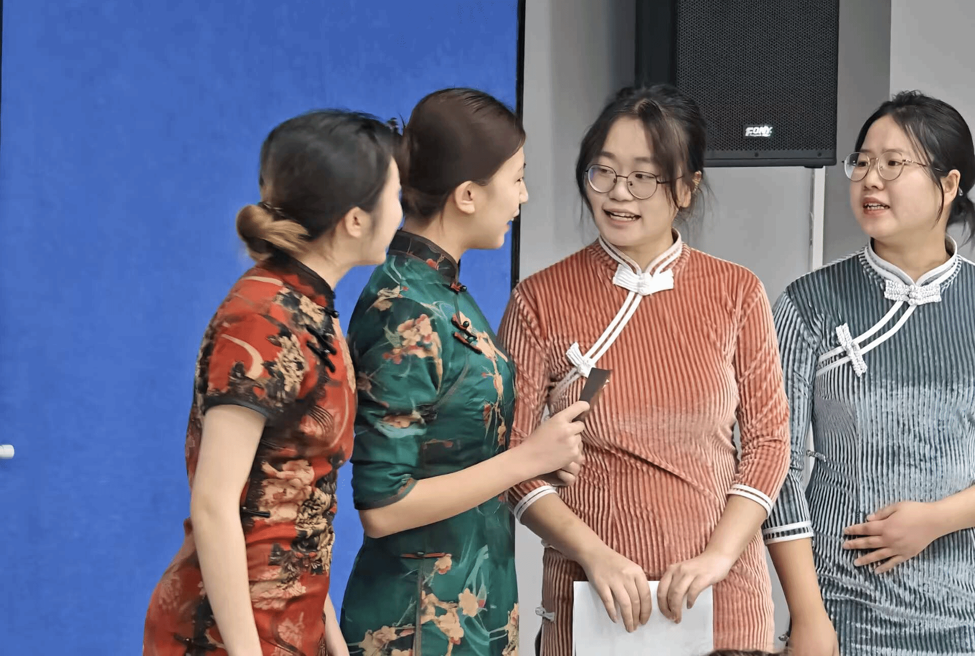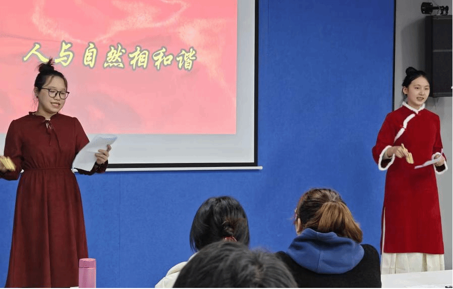 而2024级英语专升本3班的同学们则以快板的形式,歌颂了新时代。两位女同学手持快板,节奏明快,语言生动,将新时代的辉煌成就和人民生活的巨大变化娓娓道来。她们的表演既富有节奏感,又充满了正能量,让观众在轻松愉快的氛围中感受到了新时代的魅力和力量。