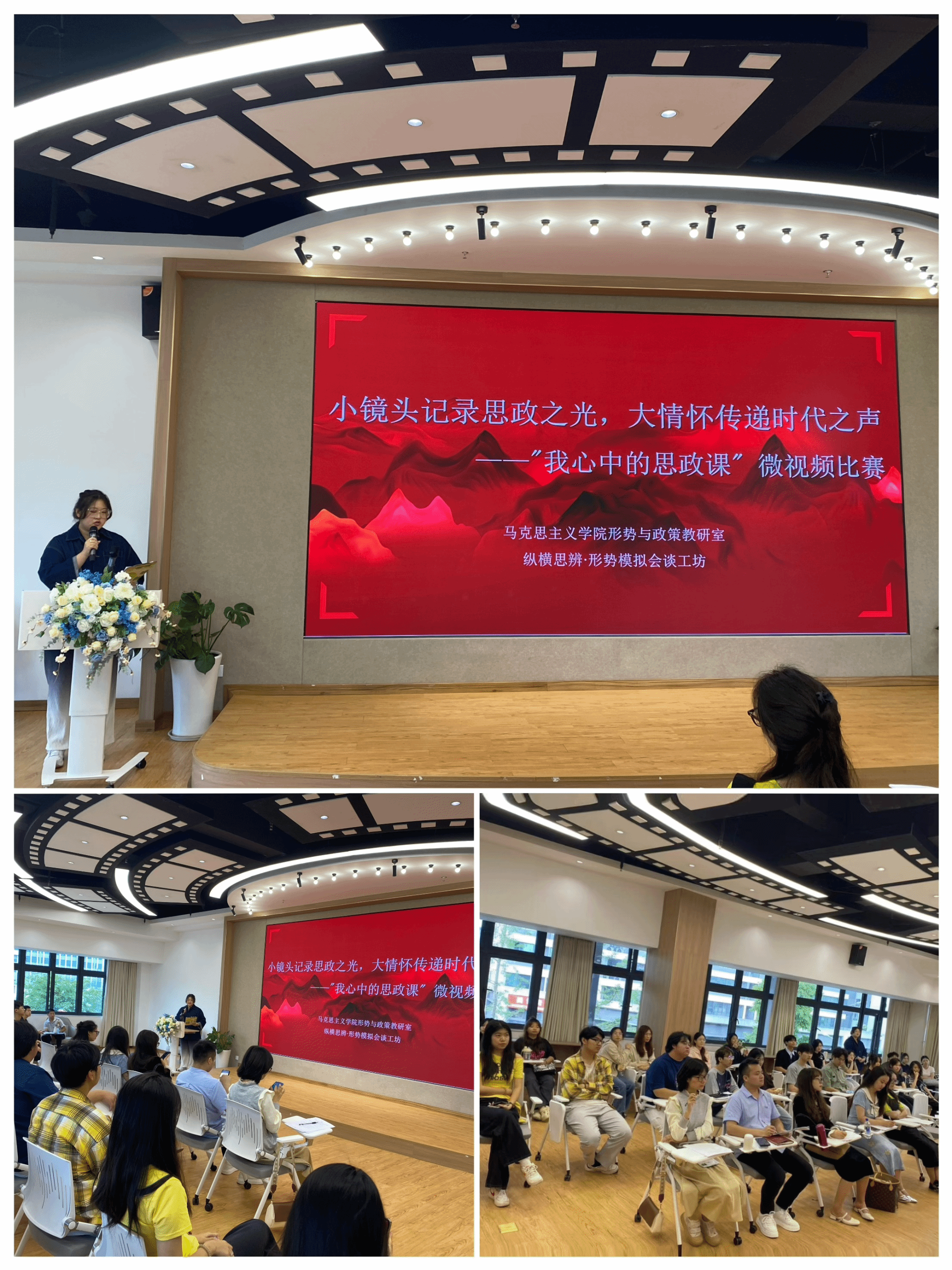 为深入贯彻落实党的二十大精神,推动思政课改革创新,激发青年学子用镜头诠释理论之美、用影像传递信仰之力。2025年5月28日下午,由《毛泽东思想和中国特色社会主义理论体系概论》课程组主办、纵横思辨·形势模拟会谈工坊承办的“小镜头记录思政之光,大情怀传递时代之声——我心中的思政课微视频比赛”决赛在电影评论中心綦谈·会客厅举行。本次比赛邀请贺铭钰、郝月霜、陈安鹏、彭玉玲、段莉五位骨干教师担任评委。