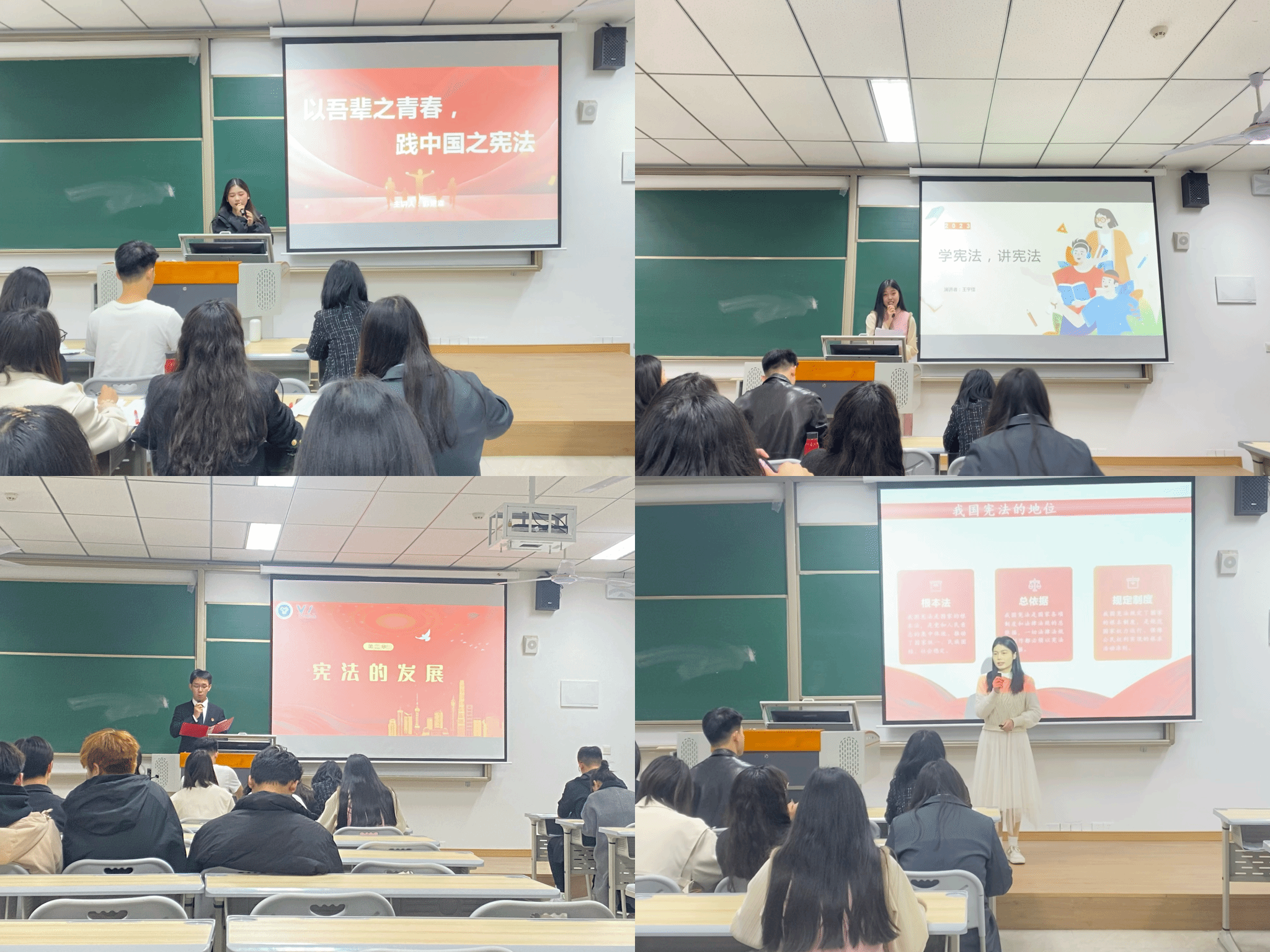 比赛伊始,主持人黄必琼老师对评委以及同学们的到来表示热烈欢迎和感谢,对赛程和比赛规则做了介绍,并祝愿同学们赛出成绩、赛出风采。随后,摩拳擦掌的同学们根据抽签顺序依次上台开始了精彩绝伦的演讲。参赛选手分别从宪法的由来、作用、地位等方面系统阐述了宪法精神,同时通过播放视频、列举案例等方式突出阐释了宪法的作用和意义。整个比赛过程,每一位选手都焕发着青春的活力,以热情和智慧点燃演讲赛场;他们全力以赴展示自己最美的风采,绽放出青年个性的光芒;他们用一支话筒为梦想发声,字字铿锵,妙语连珠,或慷概激昂,或娓娓道来。